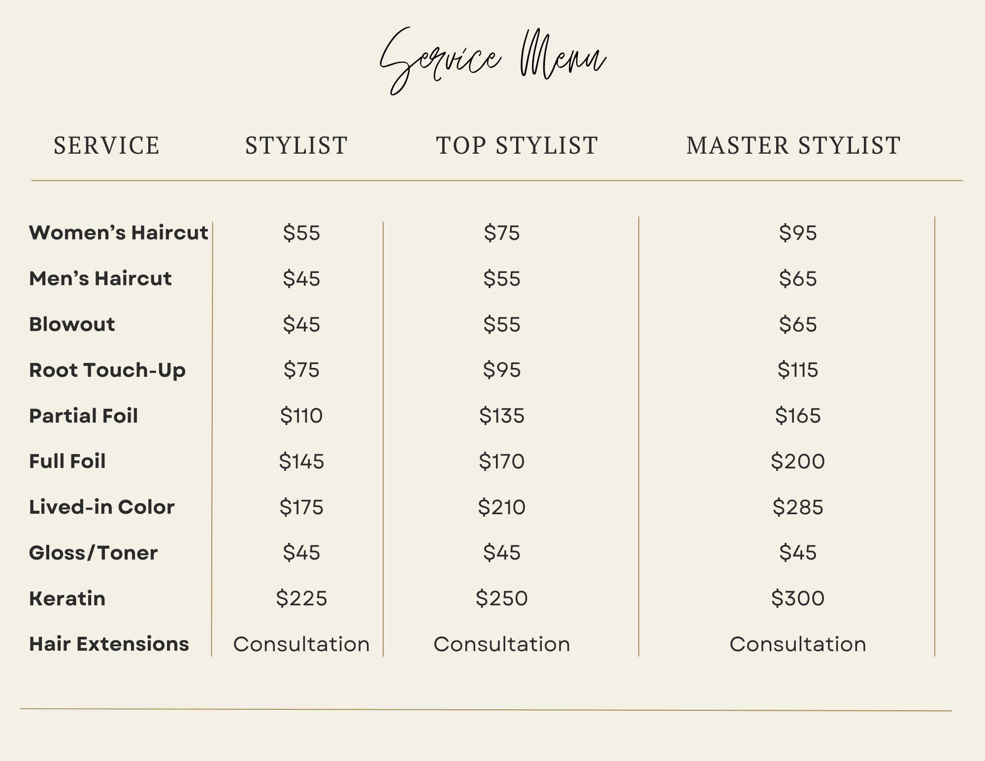Our salon-employed stylists follow our signature service standards. Their experience levels determine pricing across three tiers: